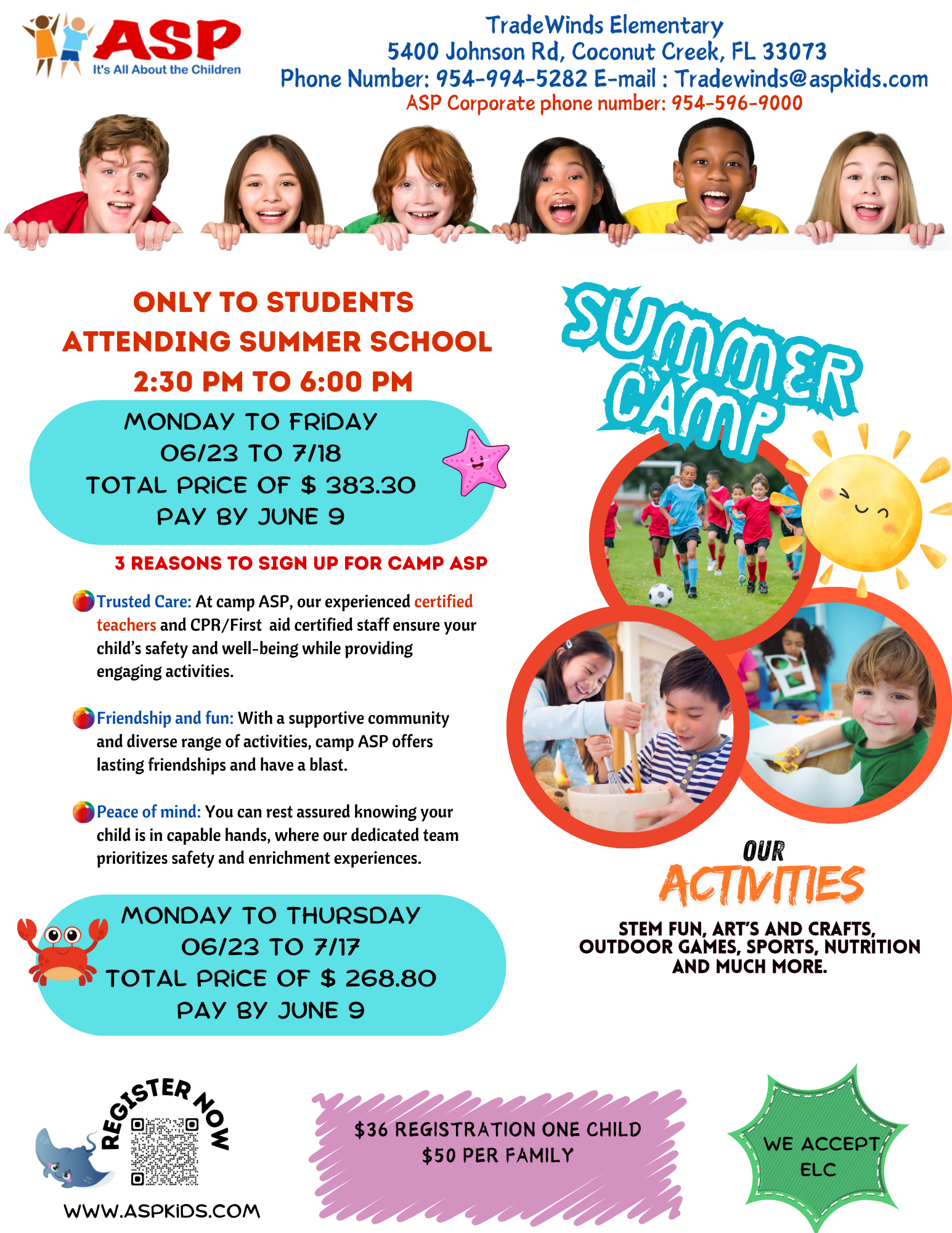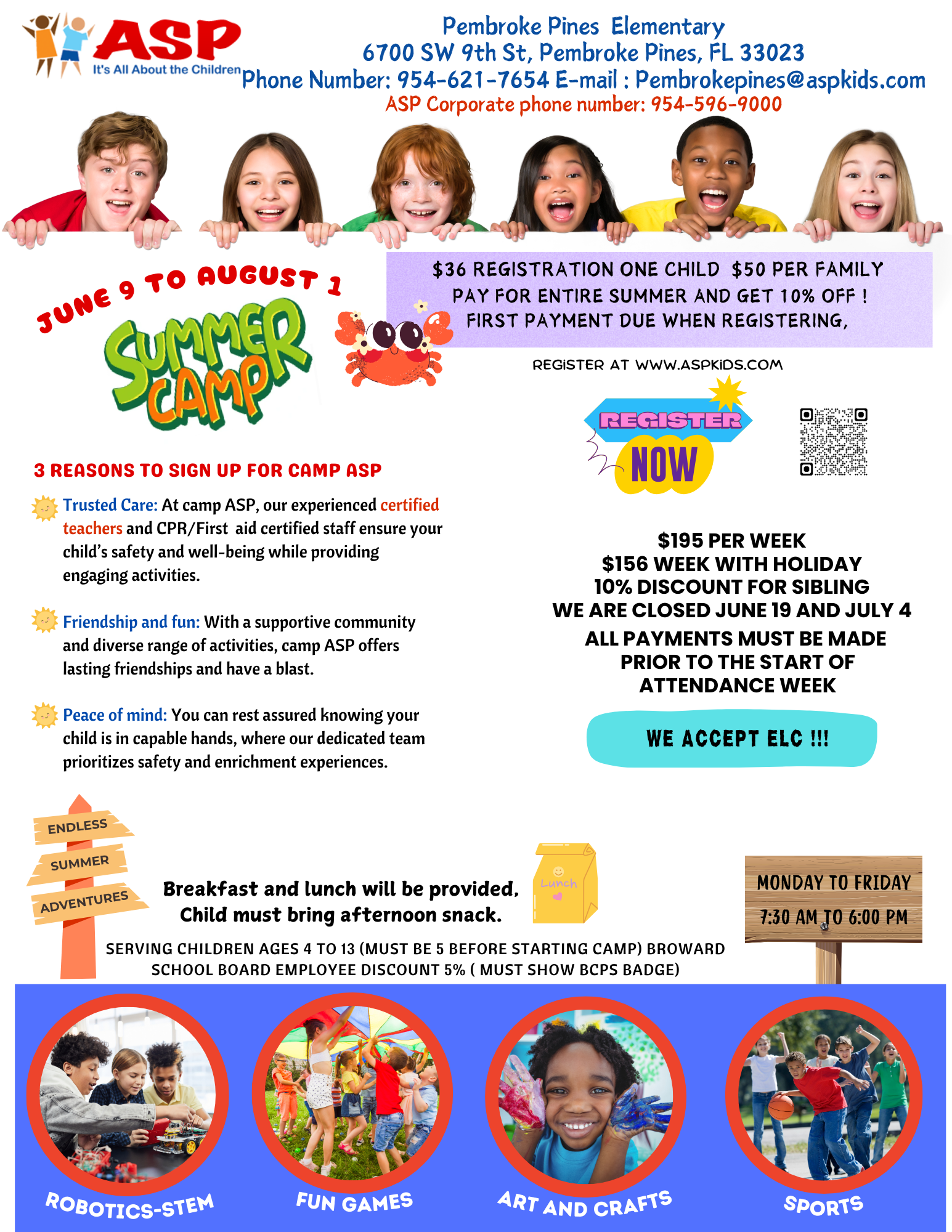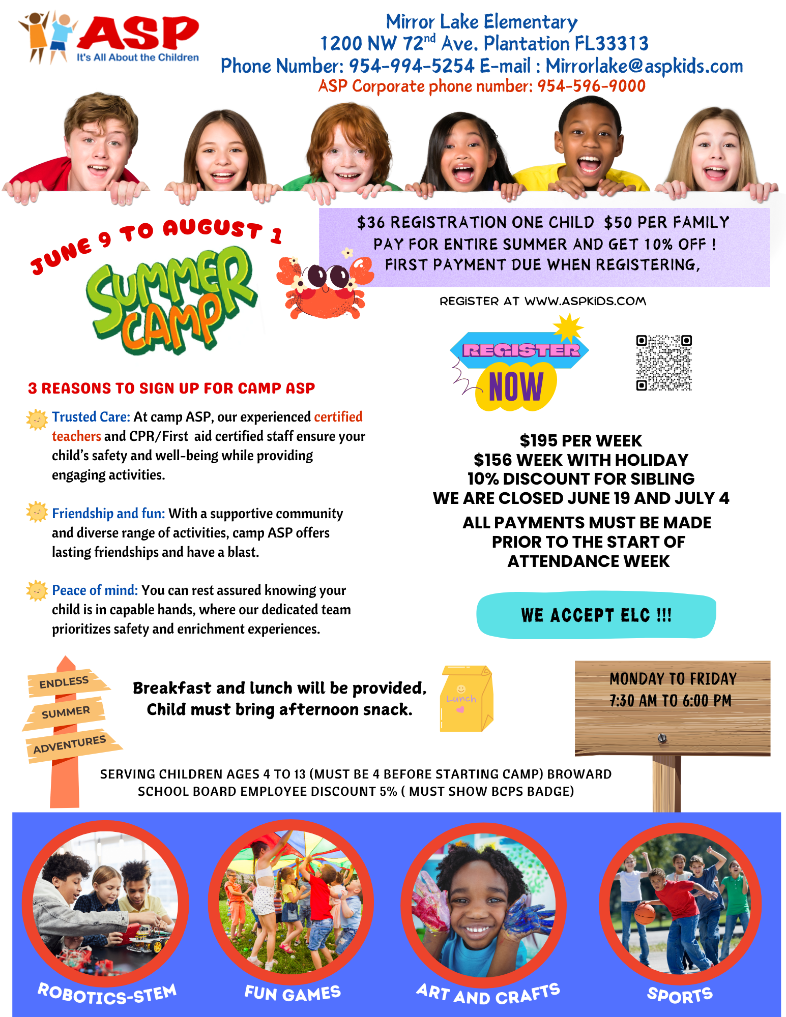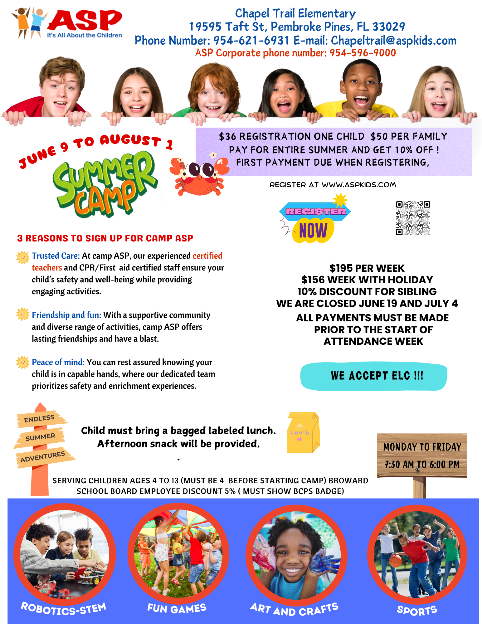 Serving children ages 5–13. Camps are open 7:30am–6pm. Available at various schools, multiple child discount 5%. For a full summer schedule or any other information, stop by your ASP program, call the corporate office or visit our website.